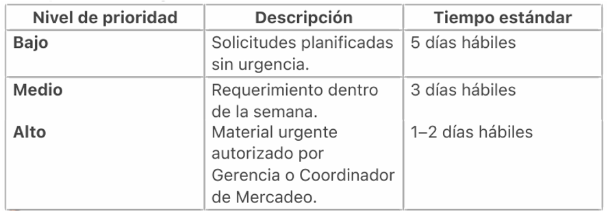 - El área de Diseño/Mercadeo revisará la solicitud y enviará una fecha estimada de entrega o aclaraciones si la información es insuficiente.
